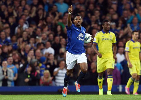 Samuel Eto’o of Everton celebrates scoring his goal to make it 3-4 Barclays Premier League 2014/15 Everton v Chelsea Goodison Park, Liverpool, United Kingdom