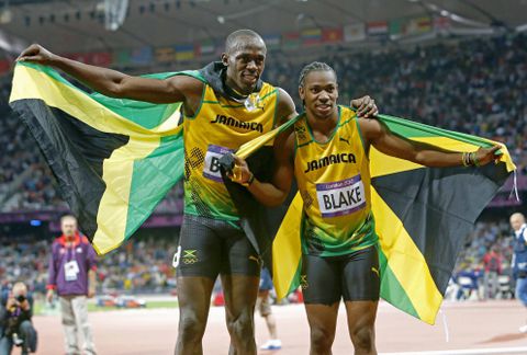 Jamaican athletes, Usain Bolt (L) and Yohan Blake, pose with the national flag after finishing first and second respectively in the men s 100-meter final at the Olympic Stadium at the 2012 London Olympics