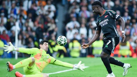 Bukayo Saka took a Panenka but it was saved by Thibaut Courtois in the Real Madrid goal before scoring later. Photo: Imago