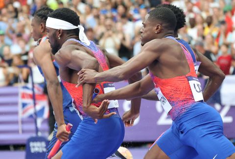 The USA were disqualified after Christian Coleman (R) struggled to hand the baton to teammate Kenneth Bednarek (Credit: Imago)
