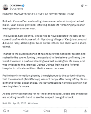 The Directorate of Criminal Investigations (DCI), in a statement issued on Saturday, April 19, 2025, said that the person of interest viciously attacked his 24-year-old ex-girlfriend, inflicting on her life-threatening injuries for leaving him for another man.