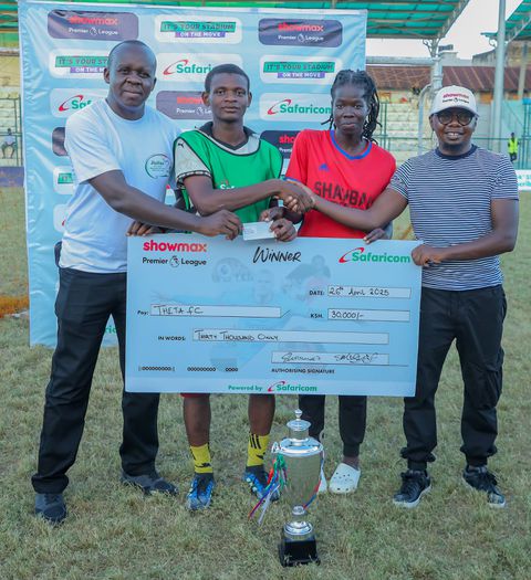 From left: Evans Muga – Safaricom Regional Marketing Lead Coast, Musa Bakar – Theta FC Captain, Yambo Velma – Theta FC Coach, and Nelson Maina – Marketing Showmax pose for a photo during a cheque presentation to the winning team