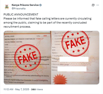 Kenya Prisons Service warns of fake recruitment letters in circulation