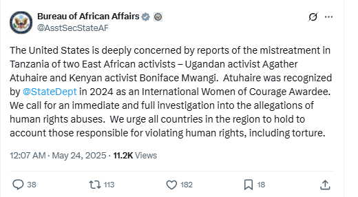 “The United States is deeply concerned by reports of the mistreatment in Tanzania of two East African activists – Ugandan activist Agather Atuhaire and Kenyan activist Boniface Mwangi. Atuhaire was recognised by @StateDept in 2024 as an International Women of Courage Awardee. We call for an immediate and full investigation into the allegations of human rights abuses. We urge all countries in the region to hold to account those responsible for violating human rights, including torture,” the statement read.