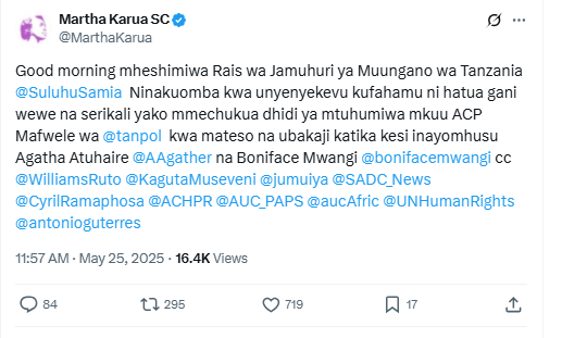 “Good morning, Mheshimiwa Rais wa Jamuhuri ya Muungano wa Tanzania @SuluhuSamia. Ninakuomba kwa unyenyekevu kufahamu ni hatua gani wewe na serikali yako mmechukua dhidi ya mtuhumiwa mkuu ACP Mafwele wa @tanpol kwa mateso na ubakaji katika kesi inayomhusu Agatha Atuhaire @AAgather na Boniface Mwangi (loosely translated to, Good morning, Hon President of the United Republic of Tanzania Samia Suluhu. I humbly ask to know what action you and your government have taken against the prime suspect ACP Mafwele of the Tanzanian Police for the torture and rape in the case involving Agather Atuhaire and Boniface Mwangi),” Karua wrote on X.
