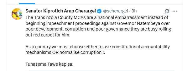 “The Trans Nzoia County MCAs are a national embarrassment; instead of beginning impeachment proceedings against Governor Natembeya over poor development, corruption and poor governance, they are busy rolling out the red carpet for him,” he posted.