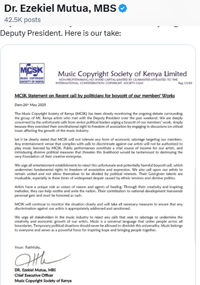 The Music Copyright Society of Kenya (MCSK) has scoffed off at leaders calling for a boycott of some of the musicians from the Mt Kenya region after they held a meeting with Deputy President Kithure Kindiki.