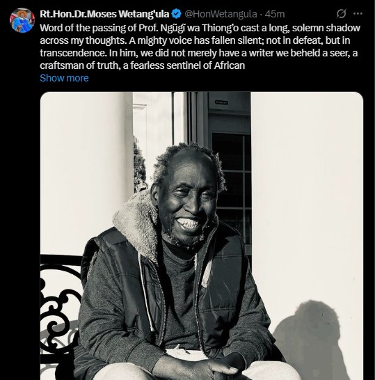“Prof. Ngũgĩ was not confined by the ordinary constraints of storytelling. He bore the soul of a continent and the cry of its people within every line he penned. His writings were not just literary artefacts, they were acts of defiance, declarations of dignity, and hymns of remembrance,” Wetang’ula wrote.