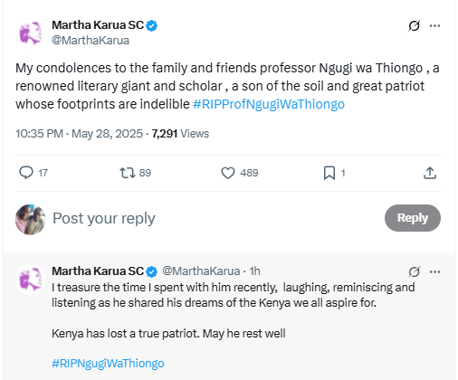 Karua joins a long list of Kenyan leaders who have shared their heartfelt messages in honour of the celebrated writer.