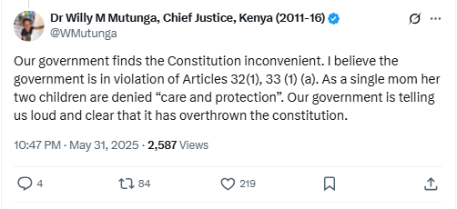 Taking to his official X account on the night of Saturday, May 31, 2025, Mutunga accused the authorities of violating the 2010 Constitution and effectively “overthrowing” it through their actions.