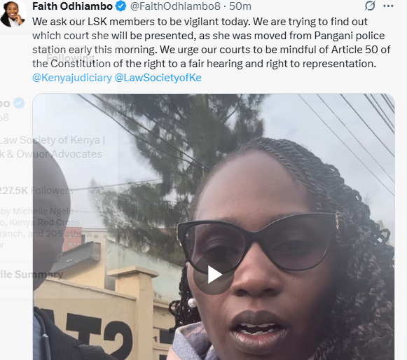 “We arrived at Pangani Police Station and have been told she had just been picked up. We ask our LSK members to be vigilant today. We are trying to determine which court she will be presented to, as she was transferred from Pangani police station early this morning,” she stated.