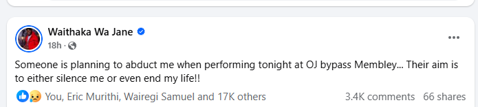 “Someone is planning to abduct me tonight while I am performing at OJ Bypass Membley. Their goal is either to silence me or take my life,” Waithaka posted, leaving fans deeply concerned and sending him prayers and words of protection.