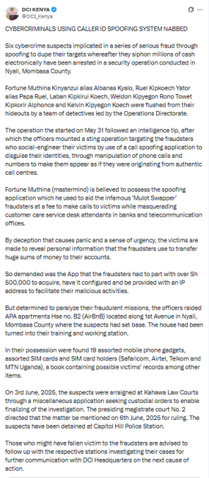 “Six cybercrime suspects implicated in a series of serious fraud through spoofing to dupe their targets, whereafter they syphon millions of cash electronically, have been arrested in a security operation conducted in Nyali, Mombasa County. Fortune Muthina Kinyanzui, alias Albanas Kyalo, Ruel Kipkoech Yator, alias Papa Ruel, Laban Kipkirui Koech, Weldon Kipyegon Rono Towet Kipkorir Alphonce and Kelvin Kipyegon Koech were flushed from their hideouts by a team of detectives led by the Operations Directorate,” the DCI statement read in part.