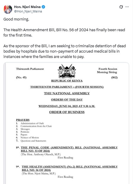 In a statement shared via her official X account on Wednesday, June 4, 2025, Njeri disclosed that the Health Amendment Bill, Bill No. 56 of 2024, has been read for the first time in the National Assembly.