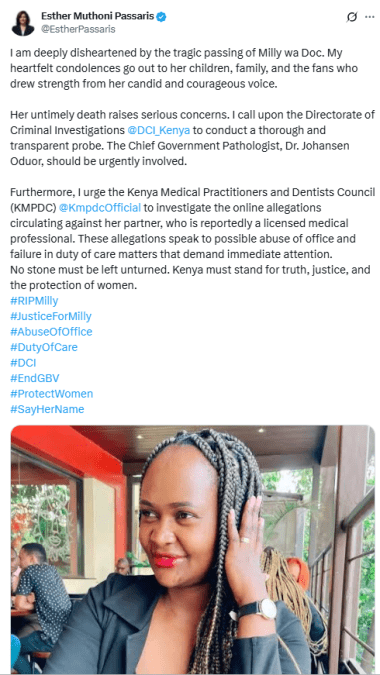 “I am deeply disheartened by the tragic passing of Milly wa Doc. My heartfelt condolences go out to her children, family, and the fans who drew strength from her candid and courageous voice. Her untimely death raises serious concerns. I call upon the Directorate of Criminal Investigations @DCI_Kenya to conduct a thorough and transparent probe,” Passaris stated.