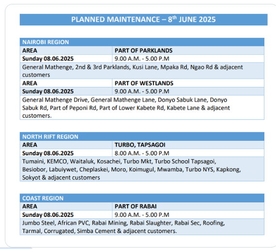 The Kenya Power and Lighting Company (KPLC) has announced a planned blackout in parts of the country, including Nairobi, the North Rift, and coastal regions, on Sunday, June 8, 2025.