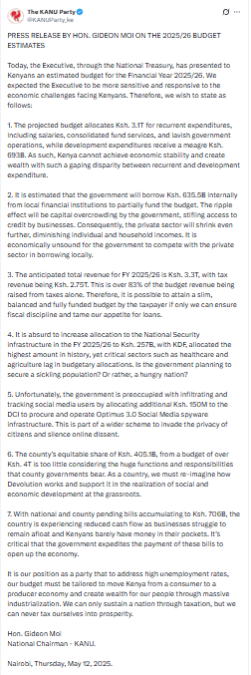 The Kenya African National Union (KANU) chairman, Gideon Moi, has criticised the Kenyan government’s proposed 2025/26 budget estimates, accusing the administration of prioritising lavish spending and surveillance over economic development and citizen welfare.