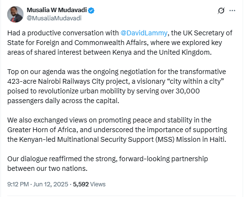 “Had a productive conversation with @DavidLammy, the UK Secretary of State for Foreign and Commonwealth Affairs, where we explored key areas of shared interest between Kenya and the United Kingdom,” Mudavadi’s statement read in part.