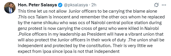 “This time, let us not allow junior officers to carry the blame alone. This OCS Talam is innocent, and remember the other OCS whom he replaced by the name Shikuku, who was OCS of Nairobi Central Police Station during the Gen Z protest, is now carrying the cross of Gen Zs who were killed in Nairobi,” he stated.
