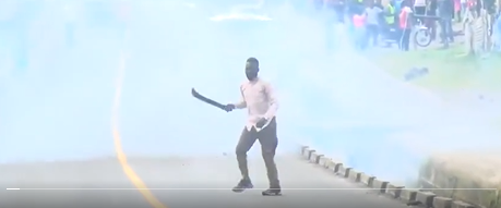 In viral footage, a man is seen approaching anti-riot police while brandishing a panga and urging other demonstrators forward.