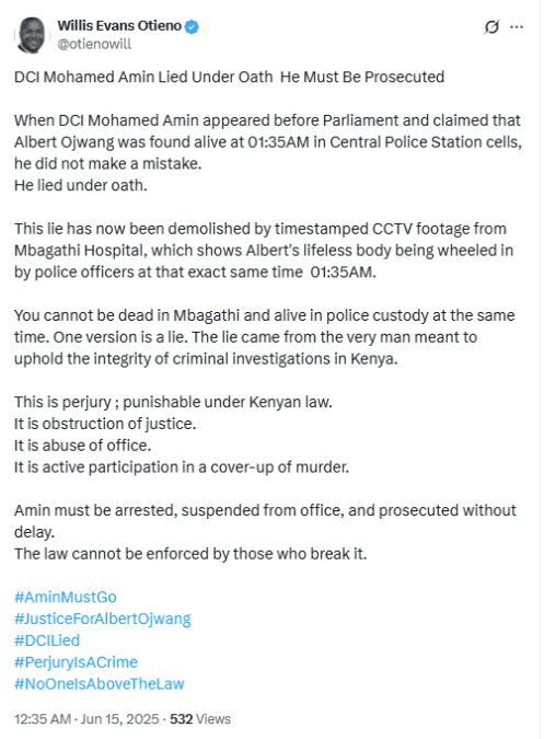 Taking to his official X account on Sunday, June 15, 2025, a few minutes past midnight, Otieno argued that Amin had lied when he appeared before Parliament when he was being grilled on the death of Albert Ojwang.