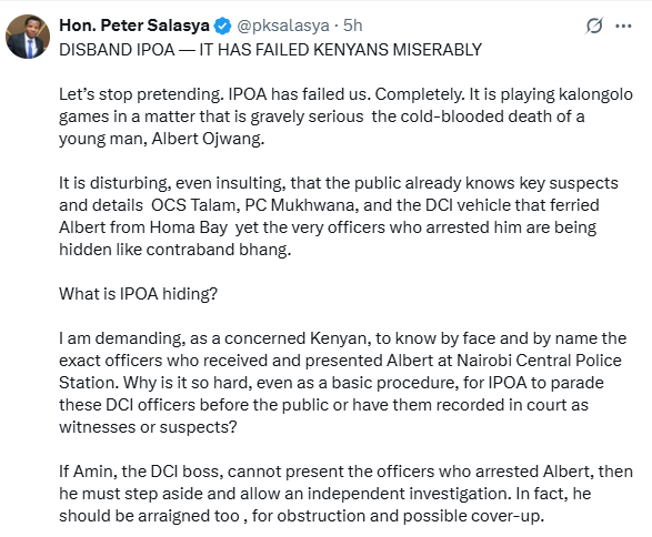 Mumias East Member of Parliament (MP) Peter Salasya has called for the disbandment of the Independent Policing and Oversight Authority (IPOA) following the death of Albert Ojwang, who died in detention hours after being arrested by the Directorate of Criminal Investigations (DCI) officers.