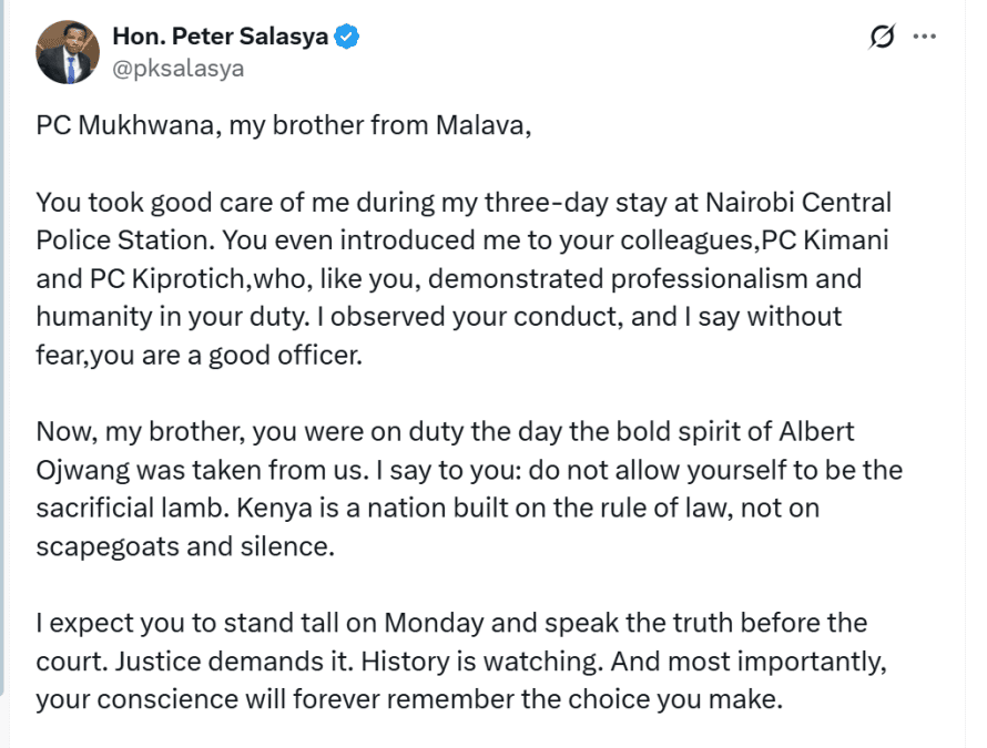“PC Mukhwana, my brother from Malava, you took good care of me during my three-day stay at Nairobi Central Police Station. You even introduced me to your colleagues, PC Kimani and PC Kiprotich, who, like you, demonstrated professionalism and humanity in your duty.