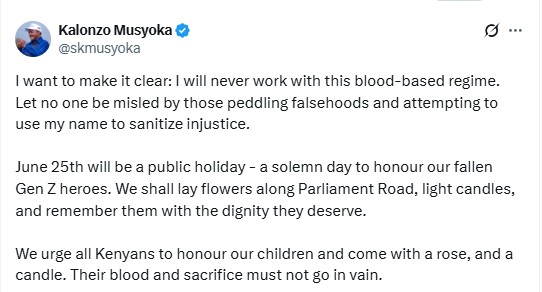 “June 25th will be a public holiday – a solemn day to honour our fallen Gen Z heroes. We shall lay flowers along Parliament Road, light candles, and remember them with the dignity they deserve,” Kalonzo stated.