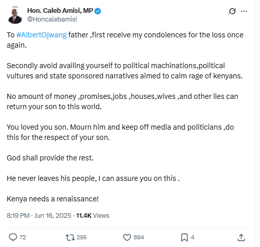 “No amount of money, promises, jobs, houses, wives, and other lies can return your son to this world. You loved your son. Mourn him and keep off the media and politicians; do this for the respect of your son. God shall provide the rest. He never leaves his people; I can assure you of this. Kenya needs a renaissance!” Amisi wrote on X.