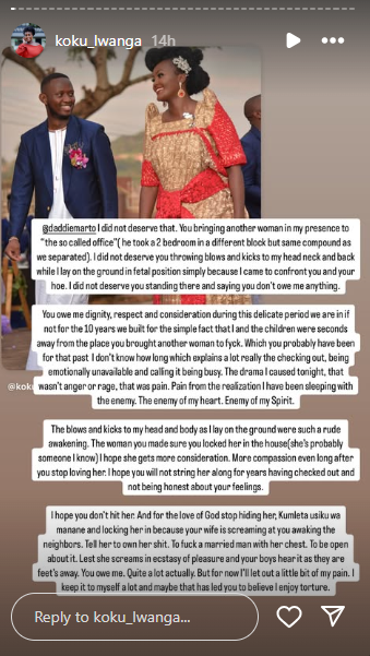 On Sunday, June 15, 2025, Koku took to her Instagram stories with a deeply emotional post revealing the end of their marriage. She accused Marto of cheating on her, claiming that when she confronted him and his other woman, she was physically attacked.