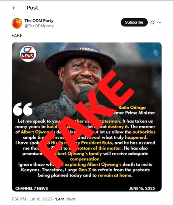 The Orange Democratic Movement (ODM) has come out strongly to disown a viral post that claimed party leader Raila Odinga had urged Gen Z demonstrators to suspend their planned protests and remain at home.