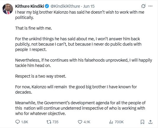 “I hear my big brother Kalonzo has said he doesn’t wish to work with me politically. That is fine with me. But I won’t engage in public duels with people I respect,” Kindiki said on X. “If he continues, I will happily tackle him head-on.”