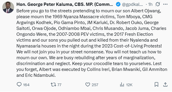 “Before you go to the streets pretending to mourn our son Albert Ojwang,” Kaluma wrote, “please mourn the 1969 Nyanza Massacre victims, Tom Mboya, CMG Argwings Kodhek, Pio Gama Pinto, JM Kariuki, Robert Ouko, George Saitoti, Orwa Ojode, Odhiambo Mbai, Chris Musando, Jacob Juma, Charles Ongondo Were, the 2007-2008 PEV victims, the 2017 Fresh Election victims, and our sons you pulled out and killed from their Nyalenda and Nyamasaria houses in the night during the 2023 cost-of-living protests!”