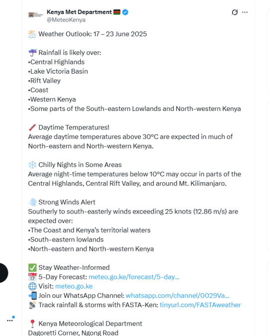 The Kenya MET post. PHOTO/Screengrab by K24 Digital of X post by @MeteoKenya
