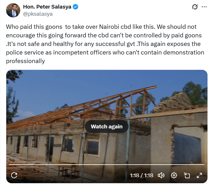 “Who paid these goons to take over Nairobi CBD like this? We should not encourage this going forward; the CBD can’t be controlled by paid goons. It’s not safe and healthy for any successful government. This again exposes the police service as incompetent officers who can’t contain demonstrations professionally,” read a post on Salasya’s X account.