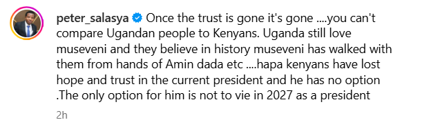 “Once the trust is gone, it’s gone… You can’t compare Ugandan people to Kenyans. Ugandans still love Museveni, and they believe in history; Museveni has walked with them from the hands of Amin Dada, etc. …. In Kenya, people have lost hope and trust in the current president, and he has no option. The only option for him is not to vie in 2027 as a president,” Salasya stated.