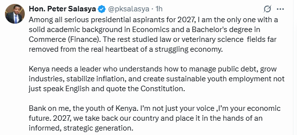 “Among all serious presidential aspirants for 2027, I am the only one with a solid academic background in economics and a Bachelor’s degree in Commerce (Finance). The rest studied law or veterinary science, fields far removed from the real heartbeat of a struggling economy,” Salasya said.