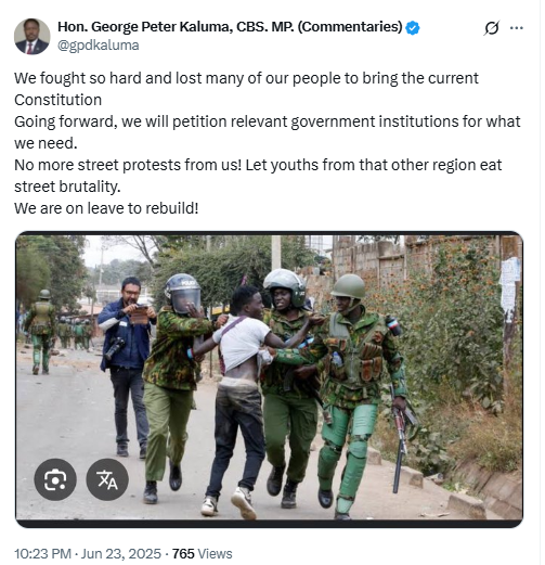 Kaluma’s remarks come barely 48 hours before the street protests scheduled for Wednesday, June 25, 2025, aimed at commemorating the June 2024 Anti-Finance Bill protests that saw many lives lost through police brutality when the parliament was breached.