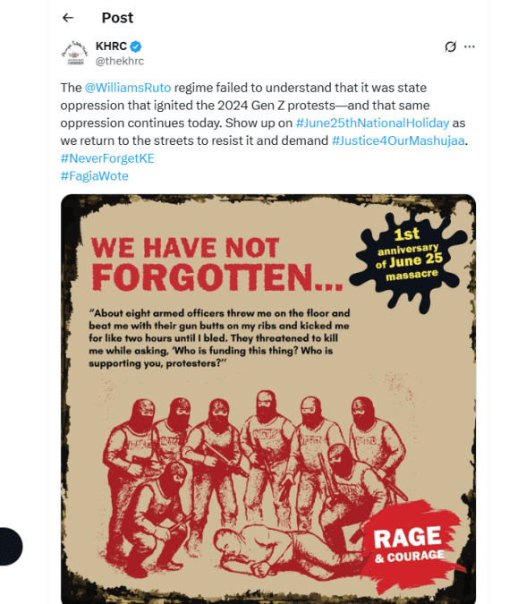 “Show up on #June25thNationalHoliday as we return to the streets to resist it and demand #Justice4OurMashujaa,” the post added, alongside popular hashtags such as #NeverForgetKE and #FagiaWote.