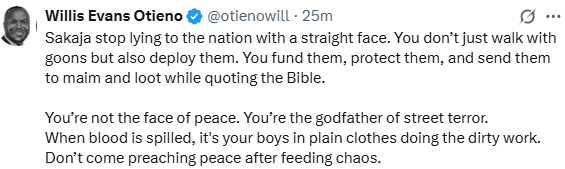 In a fiery statement issued on his X official account Monday, June 23, 2025, Otieno dismissed Sakaja’s recent public calls for peace and order as deceptive, accusing him of enabling and protecting violent groups used to suppress dissent and intimidate opponents.