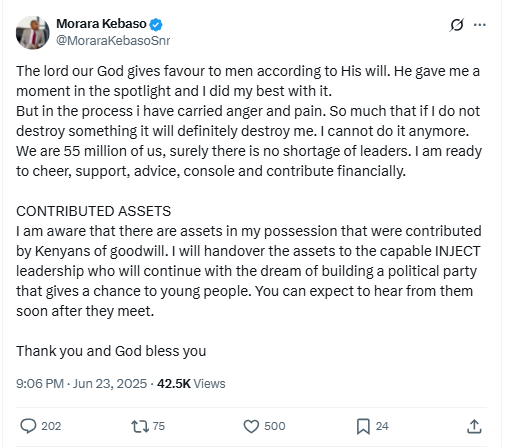 Taking to his official X account on the night of Monday, June 23, 2025, Morara stated that all the assets that were contributed by Kenyans of goodwill, which are currently in his possession, will be handed over to the capable INJECT leadership.