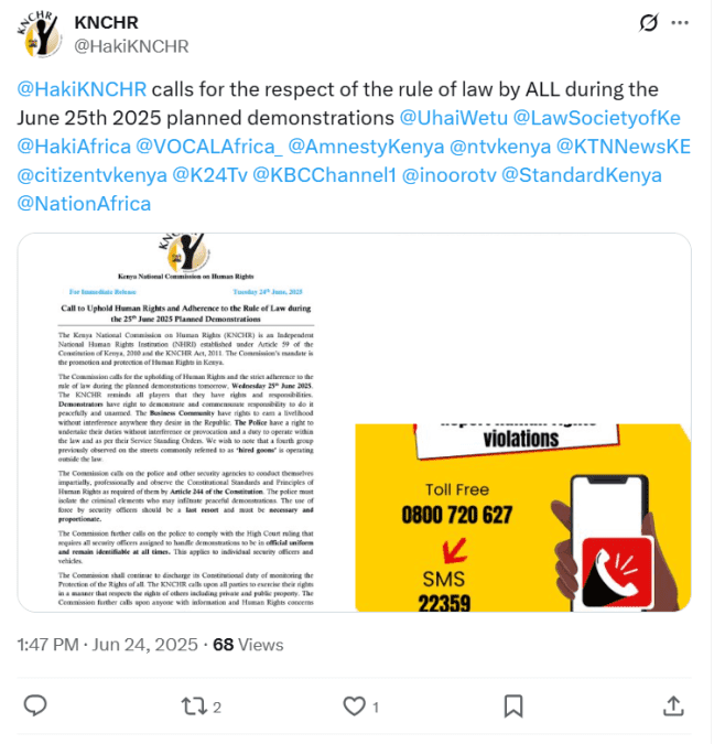 In a statement released on their official X account on June 24, 2025, the commission urged demonstrators, security agencies, and all stakeholders to uphold human rights and the rule of law during the anticipated protests. The KNCHR, a constitutionally mandated watchdog under Article 59 of the 2010 Constitution and the KNCHR Act (2011), emphasised its role in safeguarding the rights and freedoms of all Kenyans.