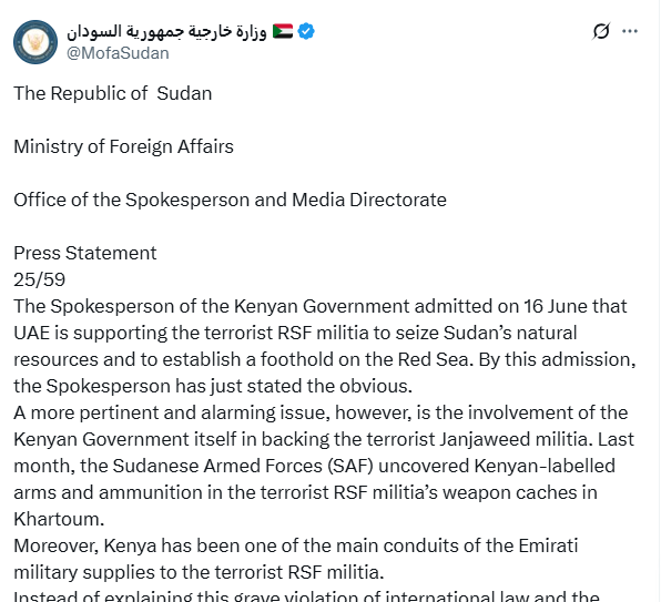 This comes after the government spokesperson, Isaac Mwaura, on June 16, 2025, admitted that the United Arab Emirates (UAE) has been supporting the RSF militia in its campaign to seize Sudan’s natural resources and gain a strategic foothold on the Red Sea.