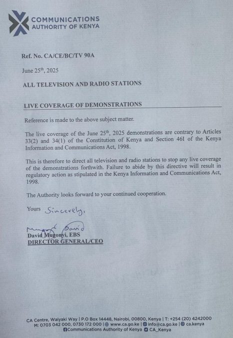 In a formal communication dated Wednesday, June 25, 2025, and addressed to all licensed broadcasters, the Communications Authority declared that the live airing of protest activities is in breach of Article 33(2) and Article 34(1) of the Constitution of Kenya, alongside Section 461 of the Kenya Information and Communications Act, 1998.