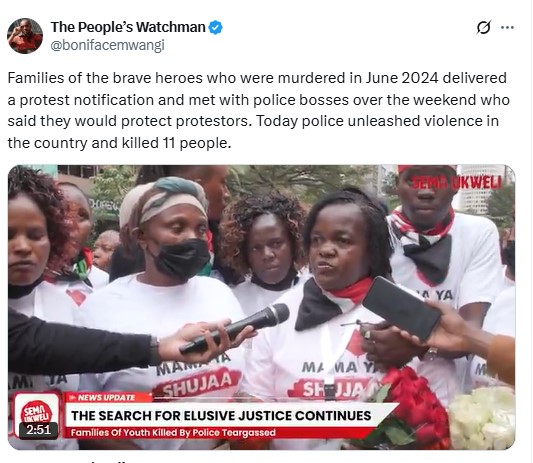 “Families of the brave heroes who were murdered in June 2024 delivered a protest notification and met with police bosses over the weekend, who said they would protect protestors. Today, police unleashed violence in the country and killed 11 people,” Mwangi lamented.