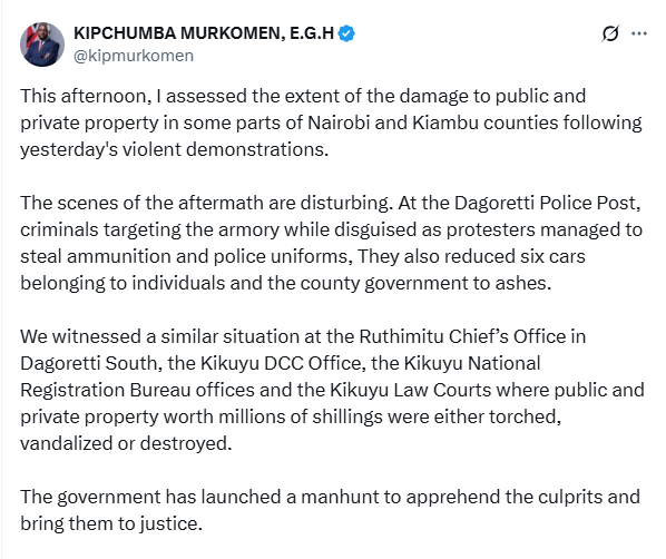 “The scenes of the aftermath are disturbing. At the Dagoretti Police Post, criminals targeting the armoury while disguised as protesters managed to steal ammunition and police uniforms. They also reduced six cars belonging to individuals and the county government to ashes,” he said in a statement.