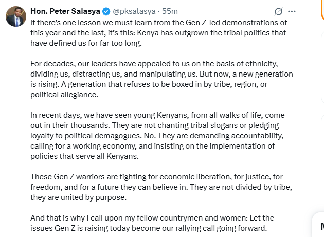“If there’s one lesson we must learn from the Gen Z-led demonstrations of this year and the last, it’s this: Kenya has outgrown the tribal politics that have defined us for far too long,” Salasya said.