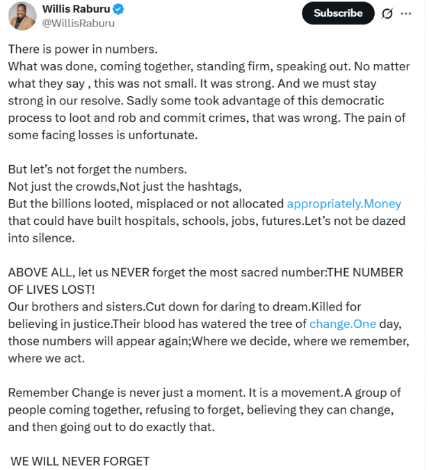 Yet, it was the human toll that anchored Raburu’s message. “Above all, let us NEVER forget the most sacred number: the number of lives lost. Our brothers and sisters. Cut down for daring to dream. Killed for believing in justice. Their blood has watered the tree of change,” he wrote.