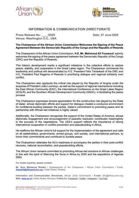 In a statement dated Friday, June 27, 2025, Youssouf termed the deal a historic milestone for the Great Lakes region.