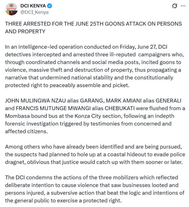 In a statement on Saturday, June 28, 2025, DCI revealed that three – John Mulingwa Nzau, alias Garang; Mark Amiani, alias Generali; and Francis Mutunge Mwangi, alias Chebukati – were arrested following an intelligence-led operation conducted on Friday, June 27, 2025.